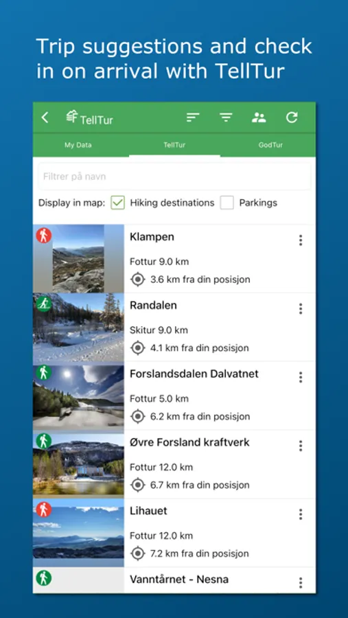 Plan your next trip with trip suggestions and descriptions from telltur.no. With TellTur you can use the app to register when you arrive at a tour destination and compete with others to visit the most places.