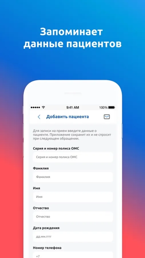 введите номер полиса ОМС, ФИО, дату рождения и телефон. Приложение сохранит персональные данные и не попросит ввести повторно при следующей записи к врачу.