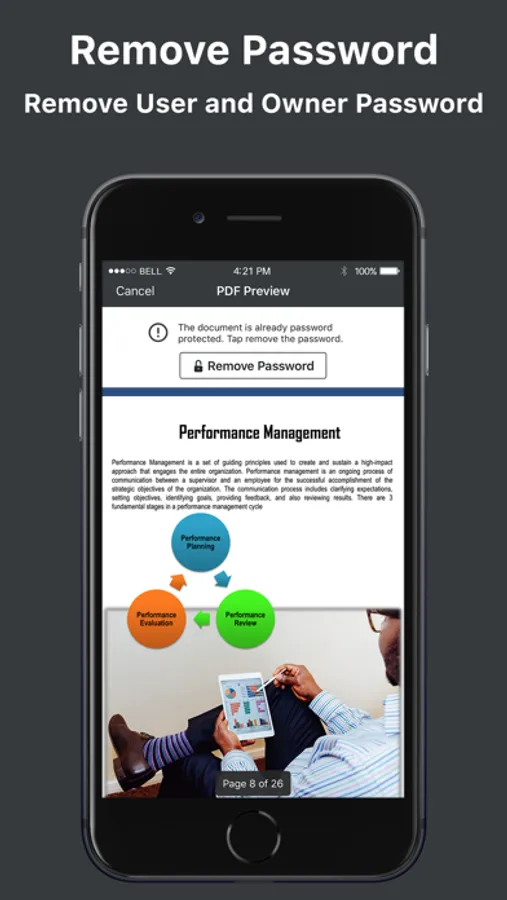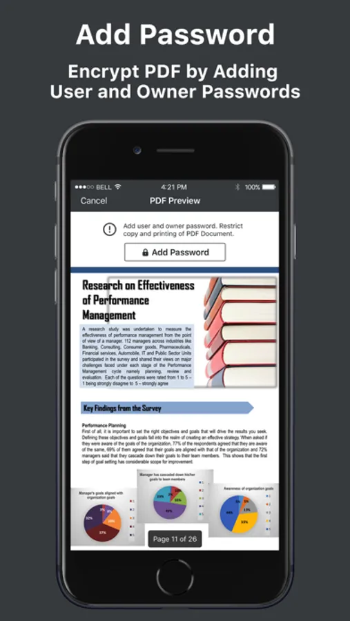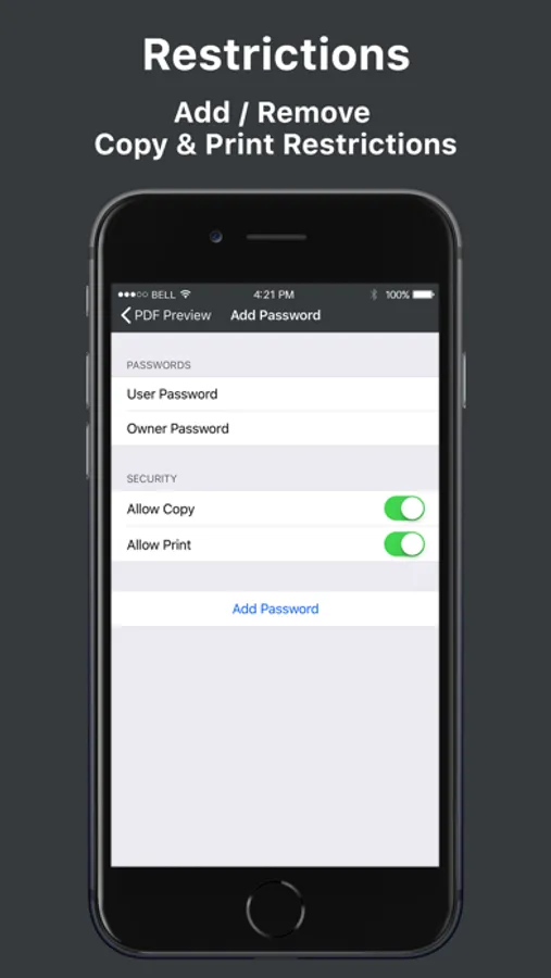 You can easily import files from your local device, email, dropbox, iCloud, Google Drive, OneDrive or any other cloud storage provider. You can add or remove password from imported PDF file. The app will automatically detect whether the imported document is encrypted or not. If it is not encrypted, you can encrypt it with user and owner passwords. You can also impose copy and print restrictions.