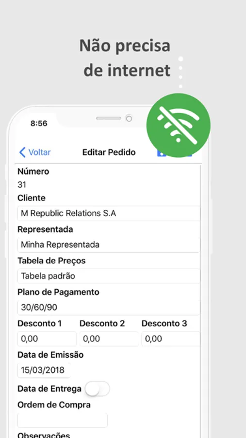 * Uma conexão com a internet é requerida para criar uma conta, sincronizar e enviar pedidos.
