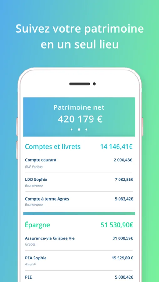 L’application mobile Grisbee est la 1ère application, gratuite et sécurisée, qui vous permet de suivre l'ensemble de votre patrimoine et de bénéficier de conseils personnalisés.
