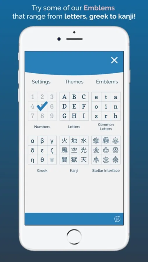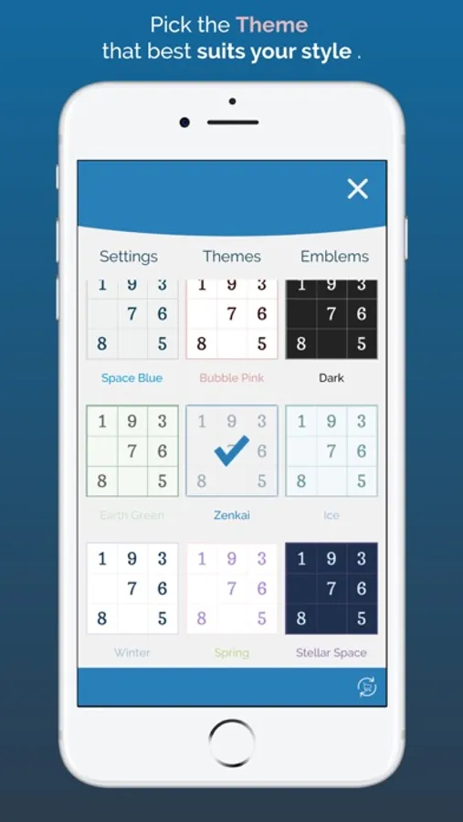 Sudoku Zenkai also features different themes allowing to play on which style you find most comfortable. Tired of numbers? With Sudoku Zenkai emblems you can spice up any Sudoku puzzle with letters, greek, kanji and more.