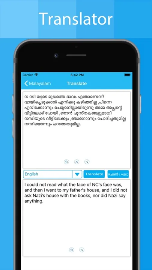 Malayalam Translator app will allow you to translate the message, story and you can share translated text to your friends and family by Facebook, Twitter, and emails.