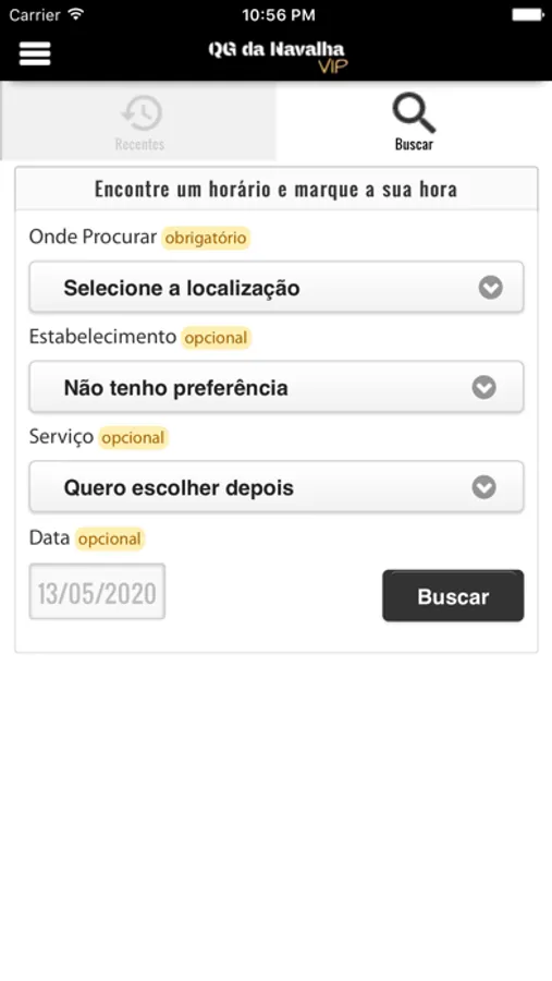 Na busca, você pode selecionar apenas o local. Os campos de Estabelecimento, Serviço e Data são opcionais!