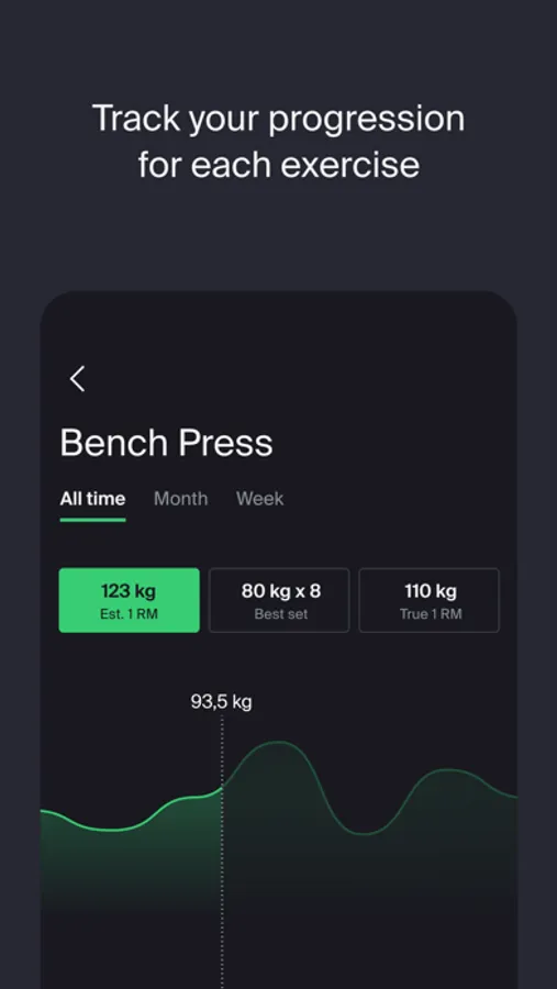 - See estimated 1RMs, real 1RMs and best set for every workout