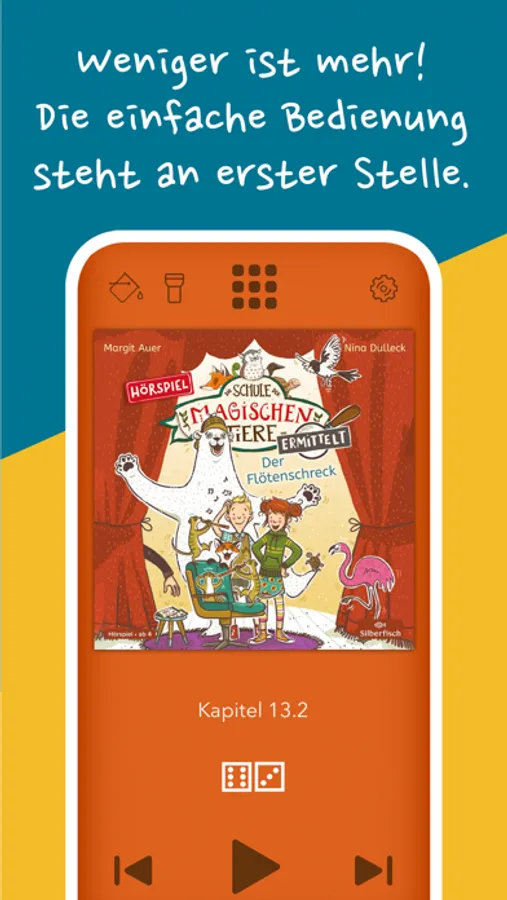 Dieser Player ist kinderleicht zu bedienen, auch wenn dein Kind noch nicht lesen kann. Beim ersten Start wählst du in den kindersicheren Einstellung eine Playlist aus deiner Mediathek. Die Playlist wird automatisch nach Alben gruppiert aus denen dein Kind in einer Cover-Galerie wählen kann. Der Player eignet sich hervorragend zum Hören von Hörspielen und Hörbüchern aber auch die Wiedergabe der kompletten Playlist ist möglich.