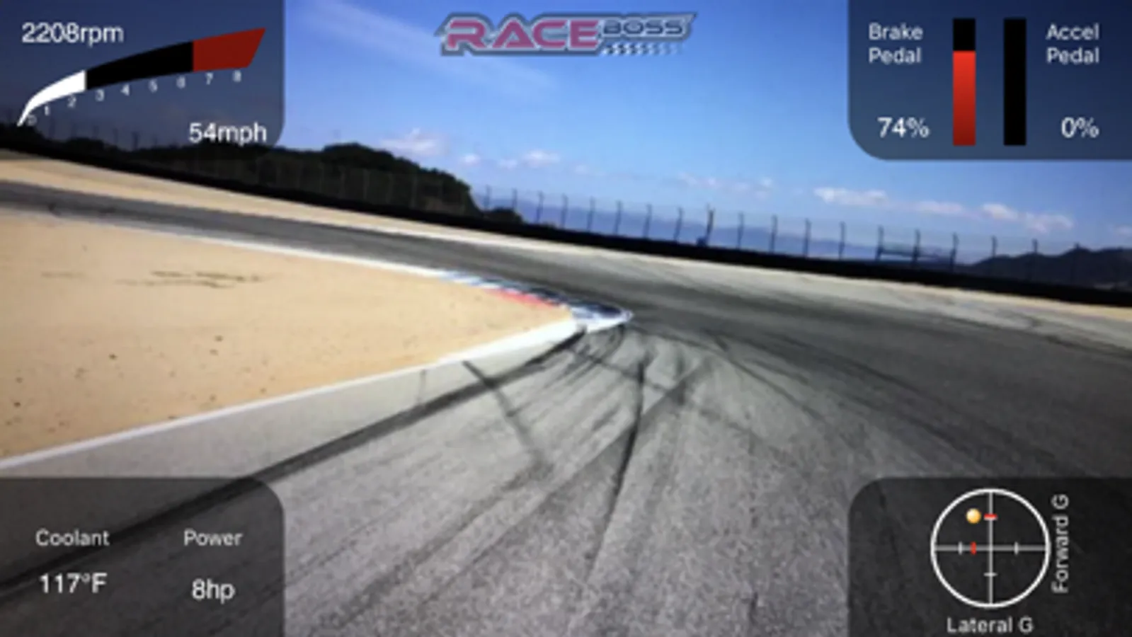 Display horsepower, RPM, vehicle speed, engine coolant temperature, brake pedal, throttle position, and G forces.