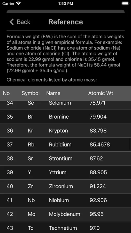 Formula weight (F.W.) is the sum of the atomic weights of all atoms in a given empirical formula. For example: Sodium chloride (NaCl) has one atom of sodium (Na) and one atom of chlorine (Cl). The atomic weight of sodium is 22.99 g/mol and chlorine is 35.45 g/mol. Therefore, the formula weight of NaCl is 58.44 g/mol (22.99 g/mol + 35.45 g/mol).