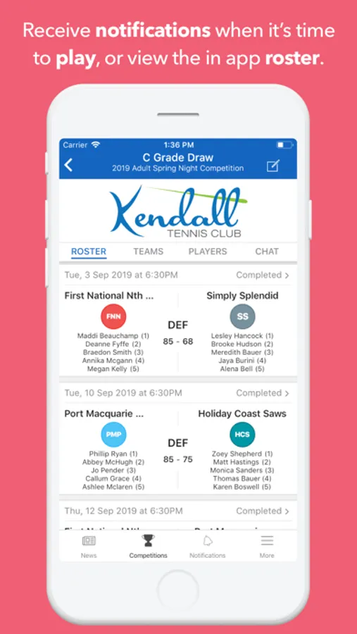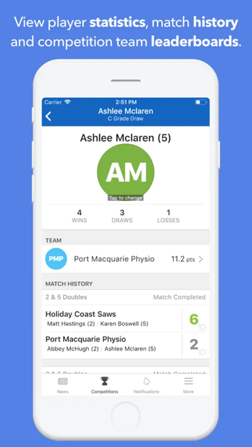 Slam provides features to manage your tennis club anywhere at any time on your mobile device, no clunky admin website required. Create and configure competitions, schedules and teams all within the app. Track team and player statistics. Slam's advance algorithms generate customisable rosters for you.