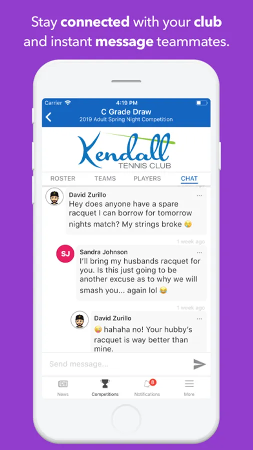 Get instantly notified when matches are cancelled, and when you or your children are scheduled to play. Keep up to date on important tennis club news, events and discussions. And with likes, comments and chat, you can get instant feedback on the pulse of the tennis club.
