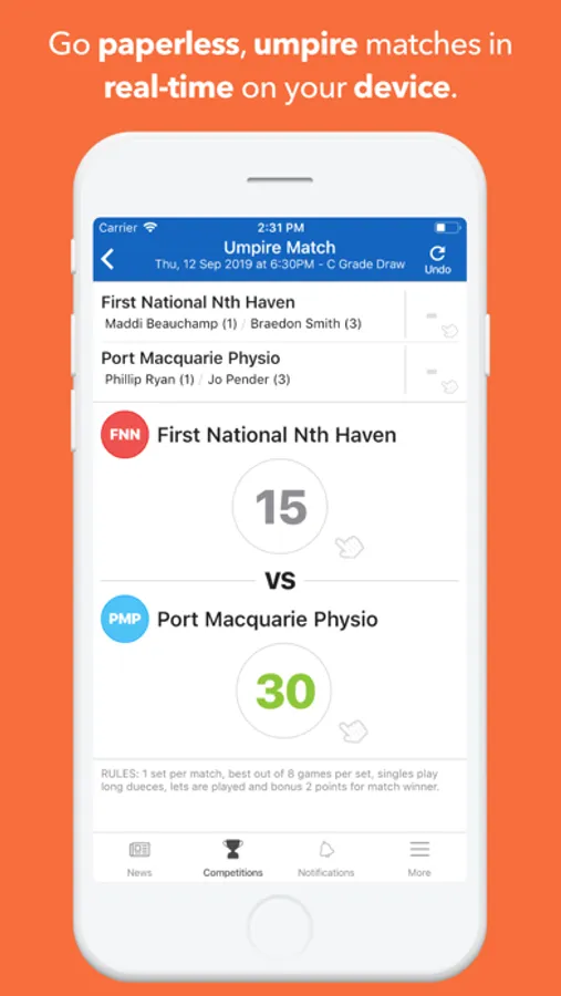 Go paperless and be more environmentally friendly. Umpire matches in real-time on mobile or tablet devices, simply tap on the screen, or enter set scores when matches are complete. Saves space and money - say goodbye to file cabinets, pens, clipboards and printing costs.