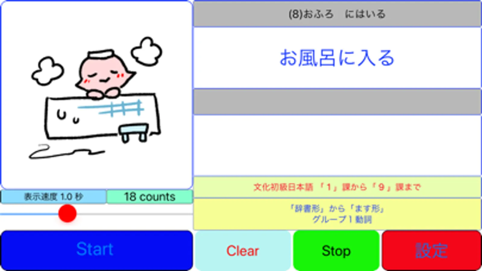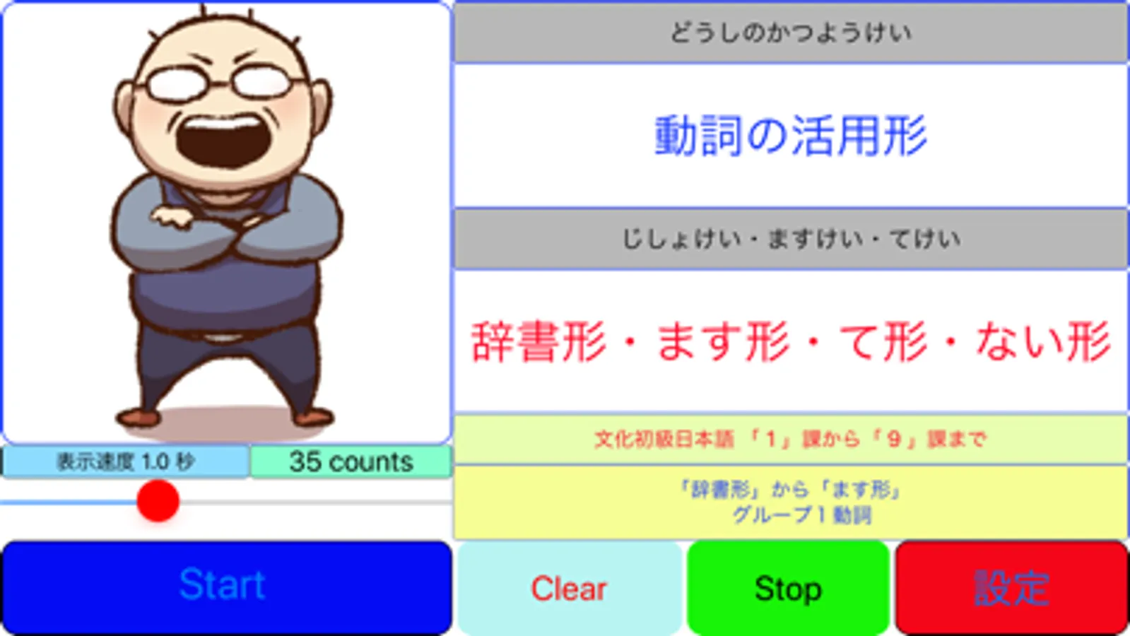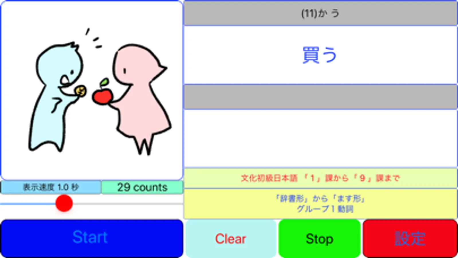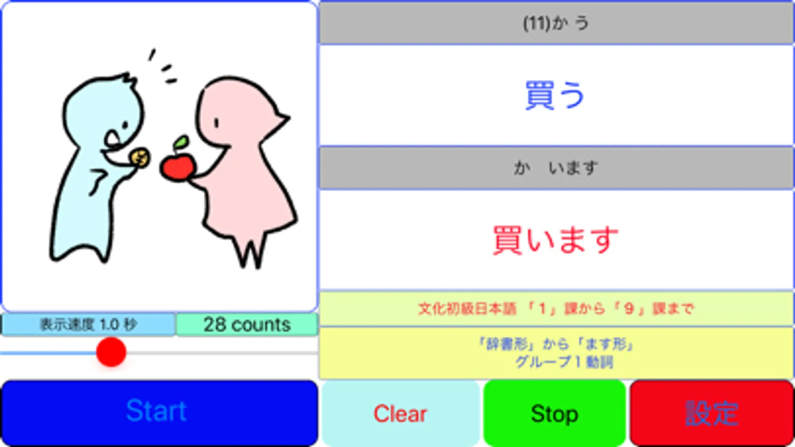 日本語動詞活用形の練習用フラッシュカードです。教師は、Lightning-HDMLケーブルを介してTVに出力するか、大きめのiPadを使用することを装丁しています。