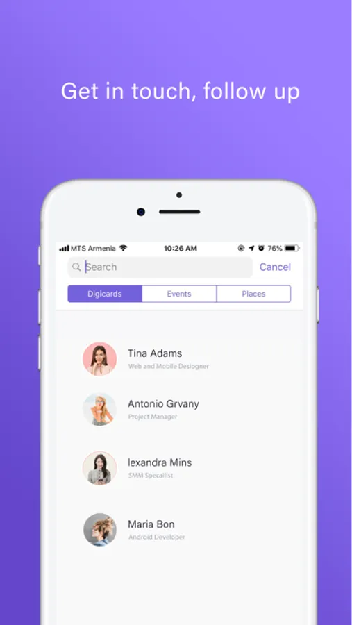 * Explore digicards of people around you - during different events, while working in coworking spaces, just walking on the street, etc …