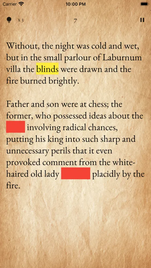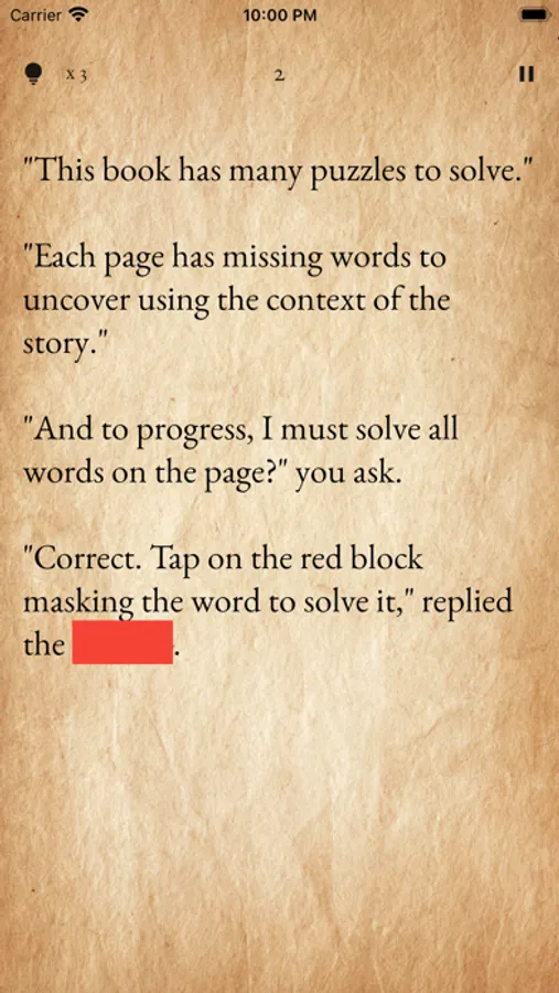 You must fill in the missing words on each page of the story in order to progress, using the context of the story as clues.