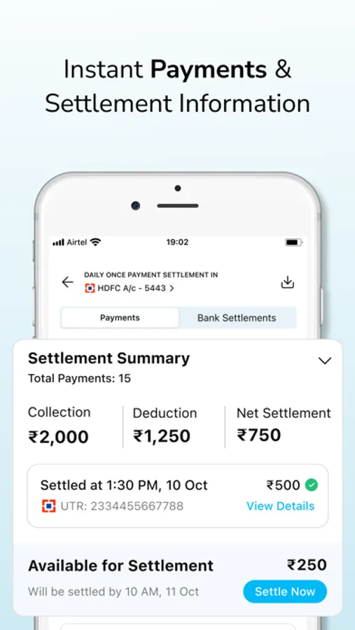 Get the money settled, select the frequency of the settlements or manually settle the amount yourself & get money in your bank account!