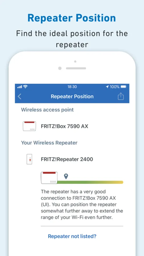 The "My Repeaters > Evaluate Repeater Position" function checks the quality of the connection between your FRITZ!Box and your FRITZ!Repeater. If the connection quality is suboptimal, you will be directed to position your FRITZ!Repeater further from or closer to your FRITZ!Box.