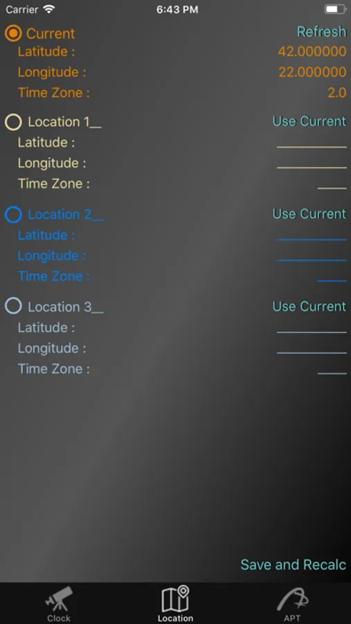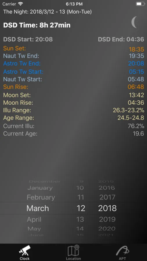 The purpose of APT DC is to calculate what is the DSD Time duration and when this time starts/ends for selected night and location. It is possible to use the current location or one of three other stored observing sites.