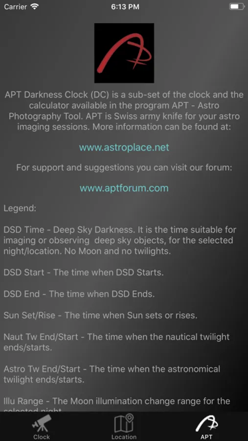 APT Darkness Clock (APT DC) is a free app without ads, that calculates the suitable time for deep sky astrophotography or observing in selected night and location. It is a small sub-set of a full featured desktop application named APT - Astro Photography Tool.