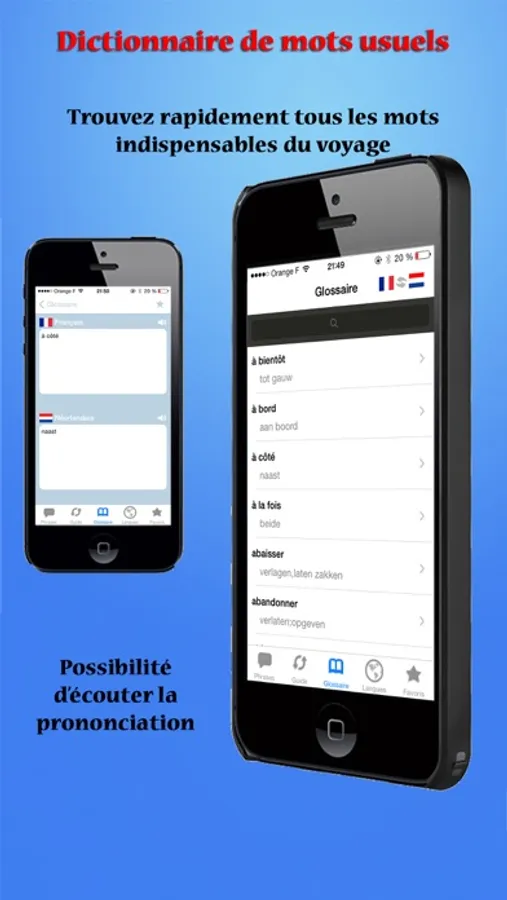 PassWorld contient aussi un glossaire bilingue des 8000 mots les plus usités dans toutes les situations que vous pourrez rencontrer pendant votre séjour à l’étranger en mode déconnecté.