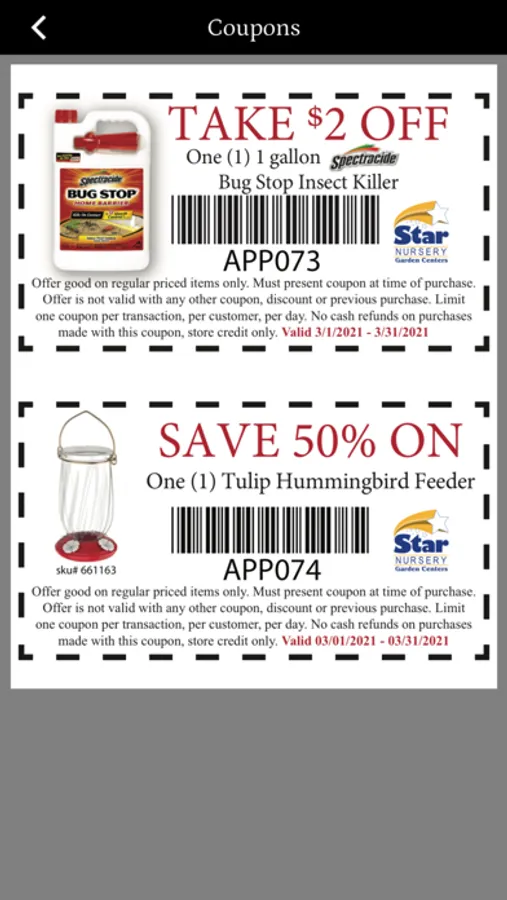 Star Nursery has developed this app to provide quick and convenient access to: Find our Weekly Ad, Star Notes with detailed explanations on plant care, Find the nearest location, Find current coupons we are offering, check out our upcoming events and social media sites.