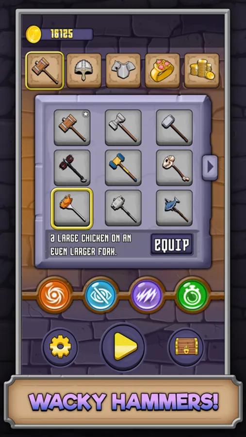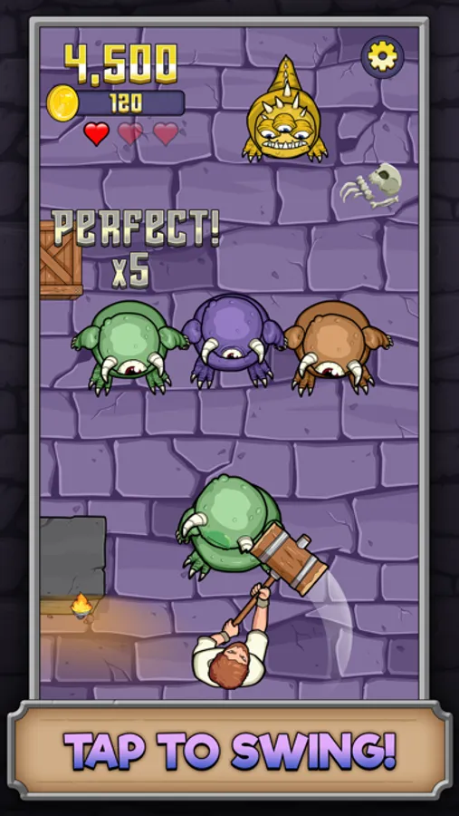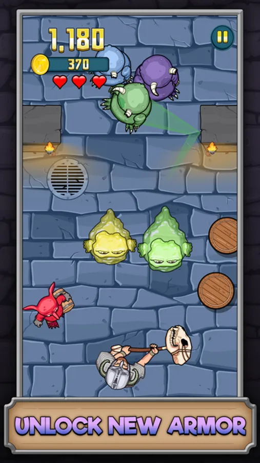 Equip your armor, pick up your weapon, and enter the dungeon! Simple one touch gameplay empowers you to swing your hammer and smash monsters, earning coins and loot along the way. Knock enemies into each other or bounce them off objects for chain kills. Unlock new powerups to venture deeper into the dungeon and reach new scores. Open treasure chests when your run is over and get more items to dungeon crawl in style!