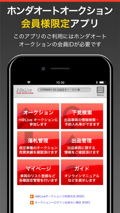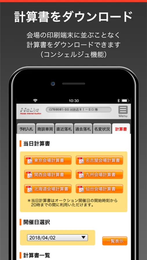 ・落札管理 〈 予約入札照会 / 商談車両照会 / 直近落札照会 / 過去落札照会 / 名変状況照会 / 計算書ダウンロード 〉