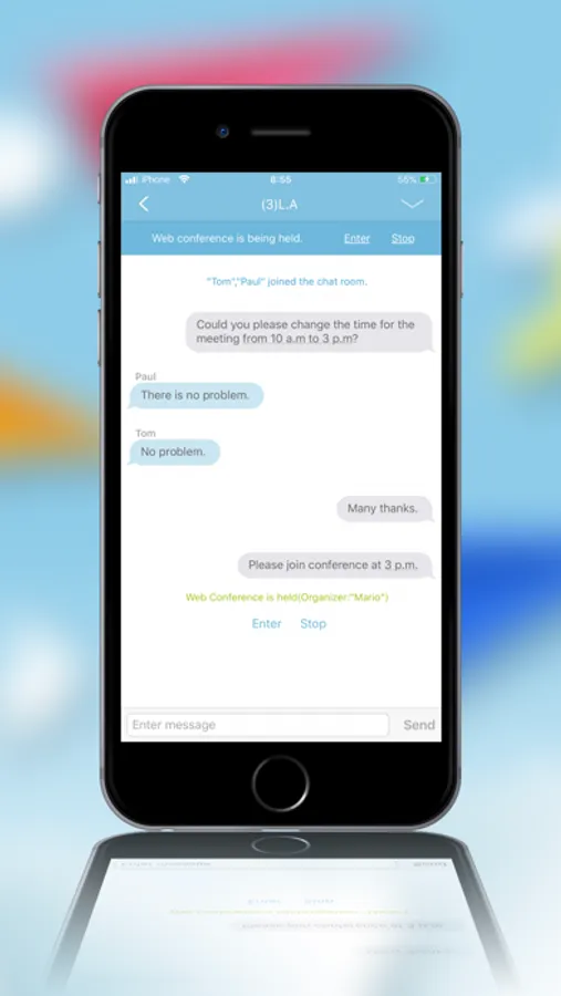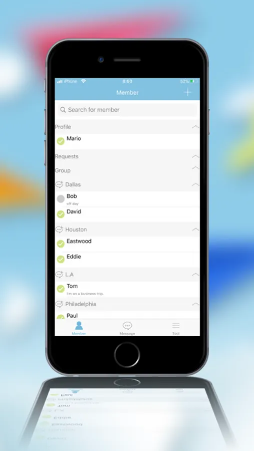 You can check the status of members at a glance and can send/receive messages and invite to a web conference at any time when they are in the login state.