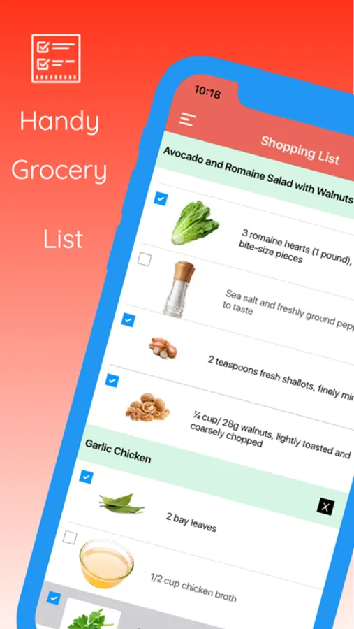 11) Shopping List - Add ingredients with image to the shopping cart as a checklist with a check and uncheck.