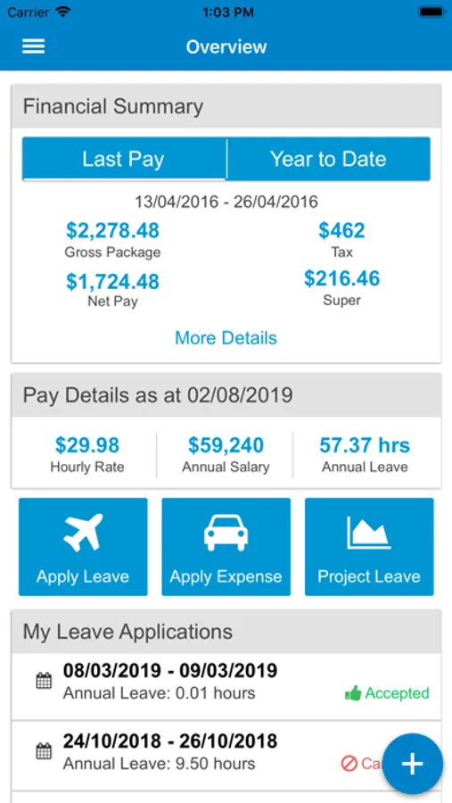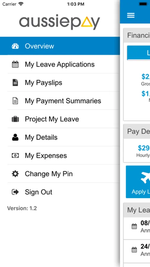 The Aussiepay & ePayroll Mobile App is an innovative employee self-service application designed for Aussiepay, ePayroll and eCorporate clients. The app allows employees to view all their payslip details, apply for leave, project annual leave, apply for expenses reimbursements and record their contact and next of kin detail. The details are available anytime from anywhere. Information is delivered securely and safely to all mobile devices.