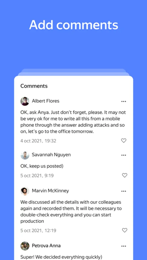 Stay in constant contact with your team, leave comments, tag specific people to get them involved, document decisions, and never get lost in reply chains.