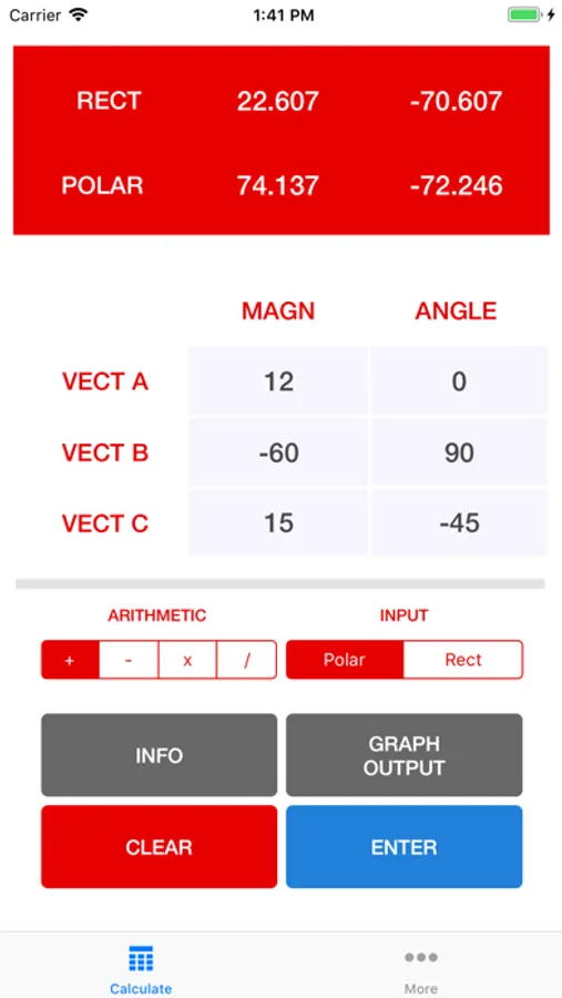 Complex Vector Calc is the easiest way to perform arithmetic on vectors. It can also convert complex polar numbers to rectangular and vise-versa. Any format can be entered and both formats are displayed as a result. This saves time converting polar and rectangular complex numbers and vectors. Complex Vector Calc allows up to 3 complex vectors and numbers to be added, subtracted, multiplied and divided. The results can be exported to WolframAlpha instantly with the push of a button.