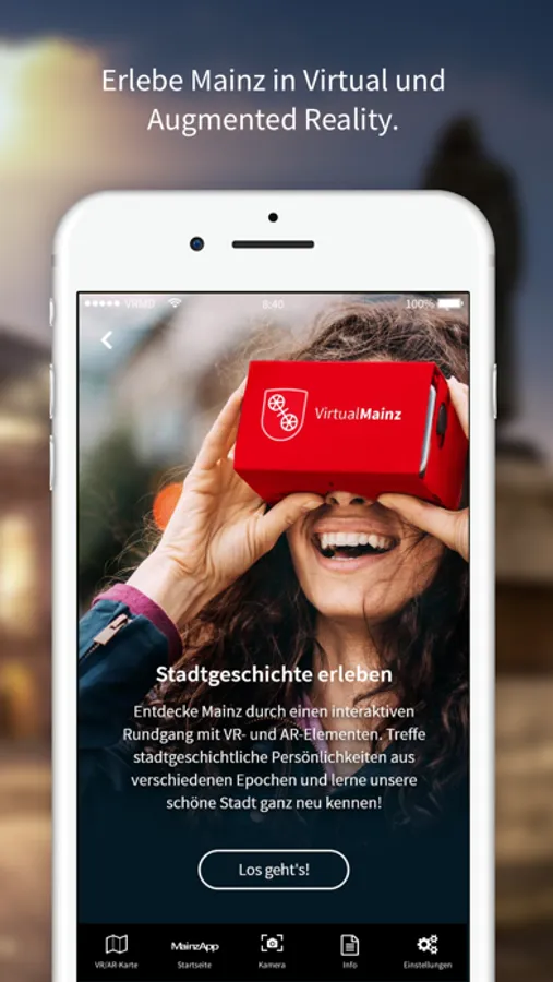 Erlebt einen besonderen Rundgang durch die Stadt am Rhein und informiert euch über alle Sehenswürdigkeiten, Unterkünfte, Einkaufs- und Gastronomieangebote. Mit dem interaktiven Veranstaltungskalender wisst ihr immer, was in der Stadt los ist. Taucht ein in die Welt der Augmented und Virtual Reality und wandert auf den Spuren Johannes Gutenbergs und den alten Römern. Spielerisch könnt ihr dabei die Stadt erkunden und euch auf die Suche nach „Gutenbergs Erbe“ machen.