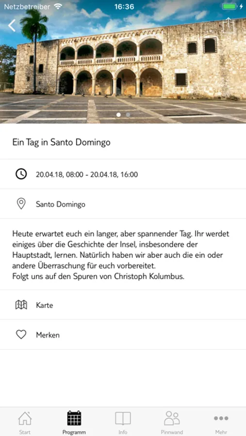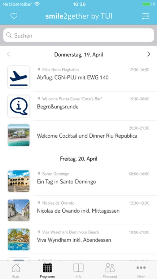 Nach einem Log-in über einen Veranstaltungscode, welchen ihr mit euren Reiseunterlagen von uns erhaltet, erlangt ihr Zugang zum Event. Klickt euch durch das vollständige Programm und findet alle wichtigen Dokumente zum direkten Download. Über die „Merken“ Funktion könnt ihr euch kinderleicht und komfortabel euer individuelles Programm selbst zusammenstellen. Die Push-Nachrichten sind ein schneller und unkomplizierter Weg für uns, euch zeitnah Erinnerungen oder Nachrichten zu wichtigen Programmpunkten der Reise zu senden. Über die „Pinnwand“ erhaltet ihr eine Gelegenheit des Austauschs mit den anderen Teilnehmern. Darüber hinaus informiert euch die App über alle anstehenden B2B Events.
