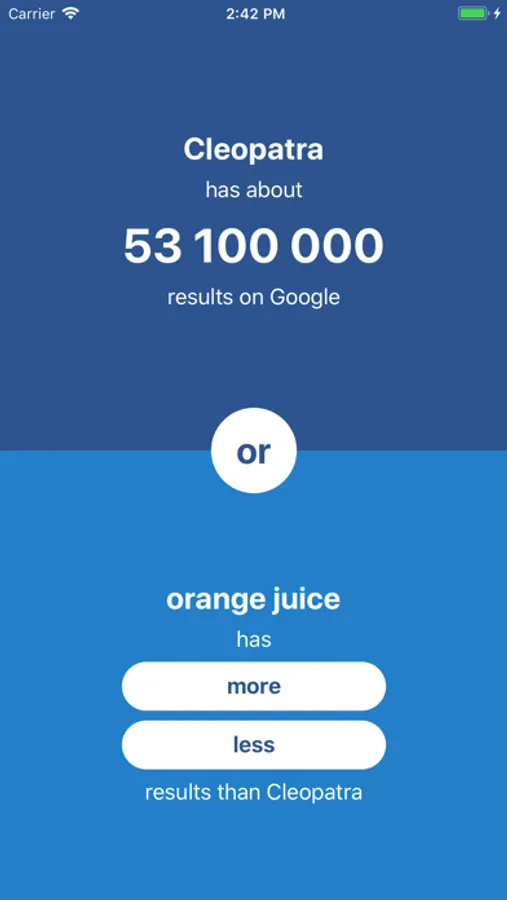 Potatoes or cactus? Guess about what people write more often on the internet! More or less is a simple but addictive game in which you have to guess which of the two phrases displayed on the screen will get more search results on Google.