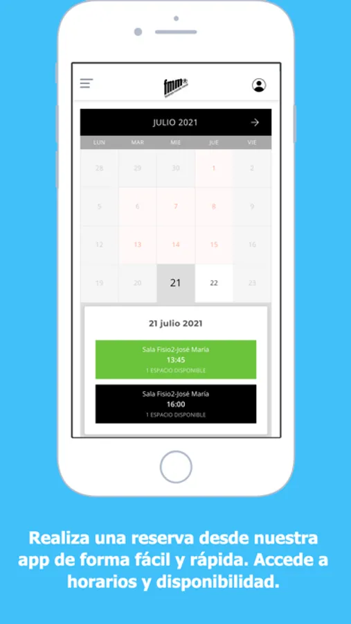 Selecciona la fecha disponible y el fisio con el que te gustaría hacer la reserva, así de fácil. Una vez aprobada te enviaremos una notificación cuando tu cita esté próxima.