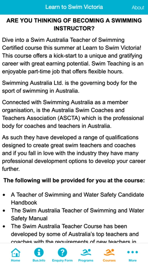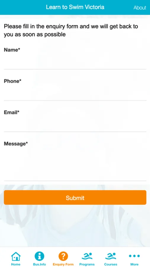 Learn to Swim Victoria App provides users to keep up to date with the latest up to date swim term information, ability to receive information at their finger tips via push push notifications, access to our swim portal, make an enquiry and many more.