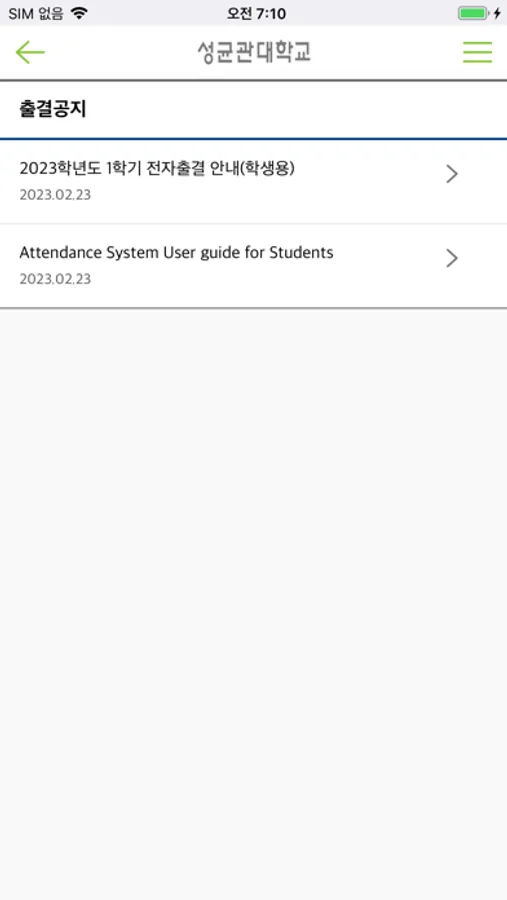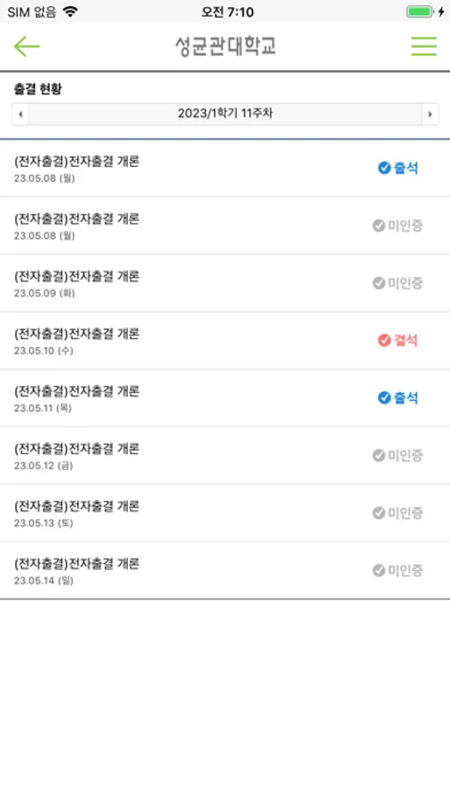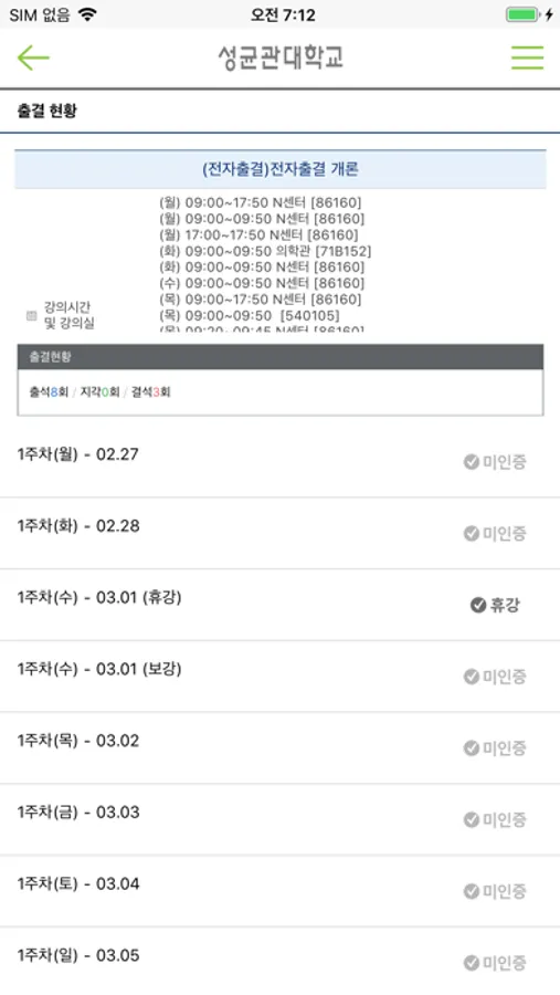 2. 출결 현황 조회 : 현재 학기의 수업을 듣고 있는 강의에 대한 출결 현황을 조회 할 수 있습니다.