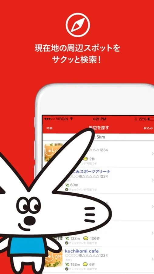 たくさんのスポット情報から現在地周辺のスポット検索はもちろん、スポットにチェックインしたり、クチコミや写真の投稿もできちゃう楽しくて便利なアプリです!