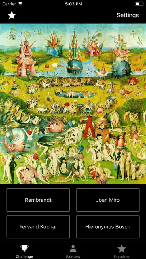 Application has three base screens. The main screen is the Challenge, which gives you 66 challenges each one containing 10 painters. If you manage to guess 10 painters in a row you win. After each challenge you should choose either to continue challenges or to try again the previews round if you lose.