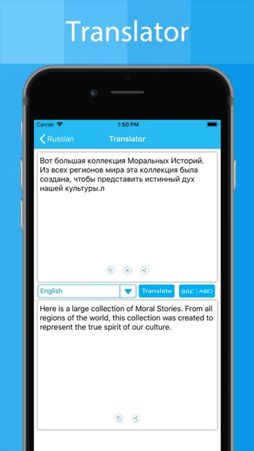 Russian Translator app will allow you to translate message, story and you can share translated text to your friends and family bye Facebook, twitter and emails.