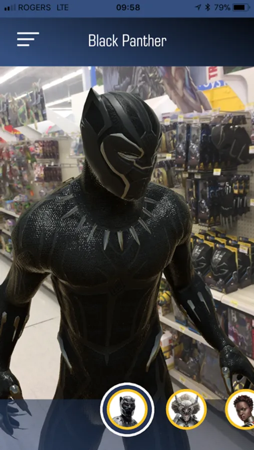 - Bring Marvel’s Black Panther characters to life with augmented reality. This app includes a 3D model of Black Panther, with the ability to unlock more characters by scanning displays at your local Walmart.