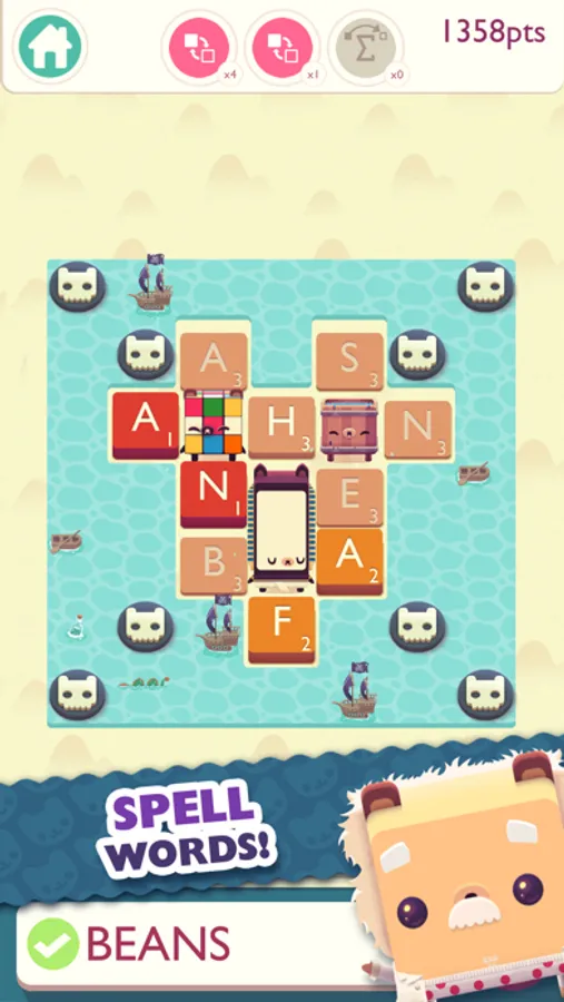 In Alphabear 2, you spell words by selecting letters on a puzzle grid. When you use letters that are adjacent to each other, bears appear! The more letters you use, the bigger the bear gets, and the more points you earn. Spelling words cleverly is the key to success!