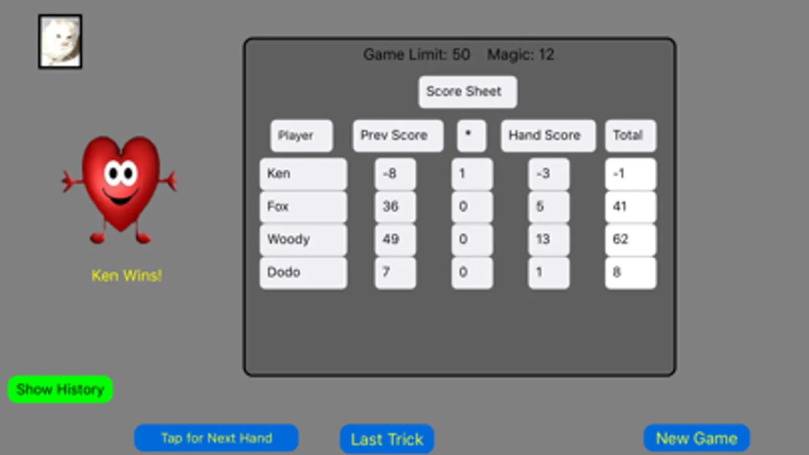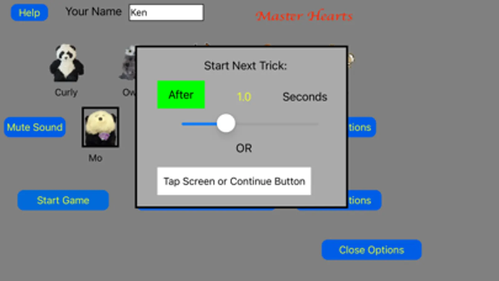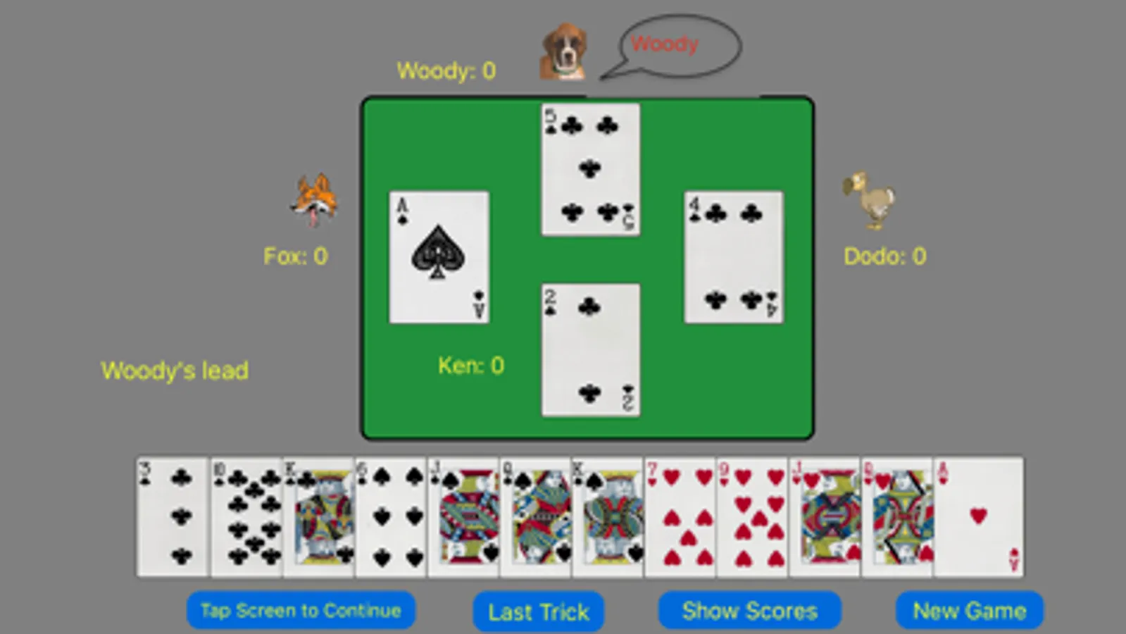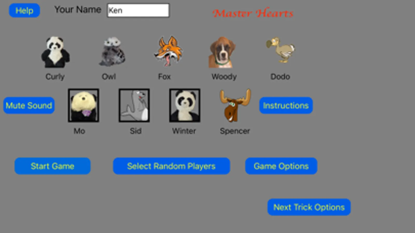 Select 3 of the 9 players to play against. Players have different playing styles and talk, saying different things. Playing options include classic Hearts rules where the opening lead is the two of Clubs, hearts count as 1 point and the Queen of Spades is 13 points. Shooting the Moon adds 26 points to the other players. Optionally, the Jack of Diamonds is -10 points and taking no tricks is -3 points. The Twanger option resets any score at the end of each hand that is a multiple of 25 (including 0) to the average of the remaining high and low scores. The Magic Number, selected at random, counts as a Twanger hit and also carries a 10 point assessment, called an Asterisk, at the end of the game. Asterisks also are assessed for looking at the Kitty when you are not supposed to and for leading a Heart before Hearts have been broken. Only the player winning the first Heart may look at the Kitty.