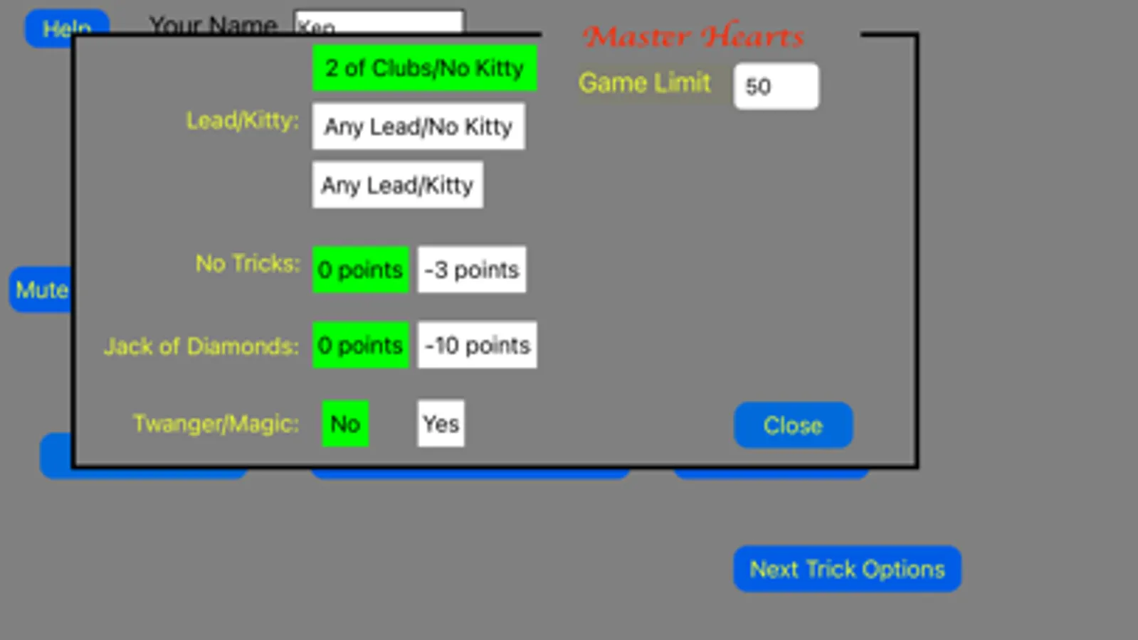 The Jack of Diamonds, no tricks, Twangers, Magic Number, Kitty, and Asterisks all are options that can be chosen by the user.