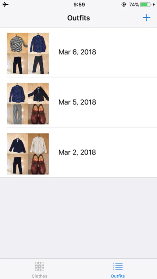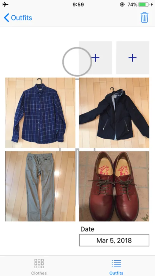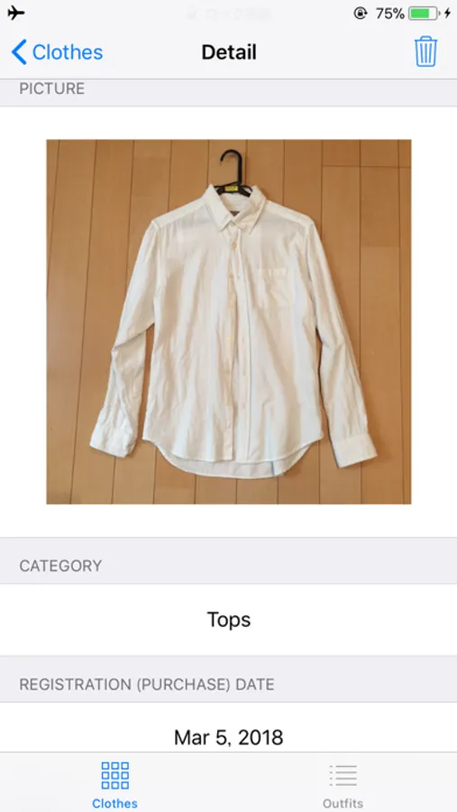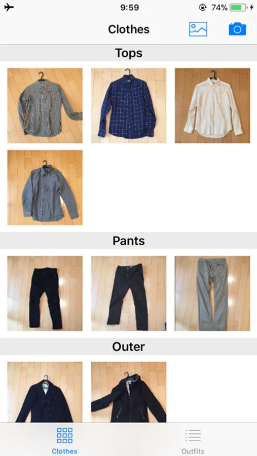 You can see that registered clothes are displayed by categories.The clothes are added by camera function or selecting from camera roll. And you can make a note to each clothes.