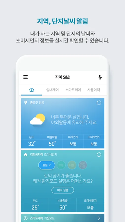 내가 사는 지역 및 단지의 날씨 뿐 아니라 미세먼지와 초미세먼지 정보를 실시간으로 확인하실 수 있습니다.