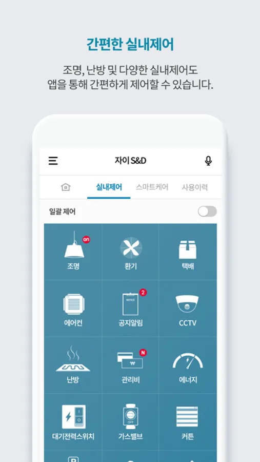 조명, 난방 및 다양한 실내제어도 앱을 통해 제어할 수 있고, 관리비나 공지사항, 택배 등의 알림사항도 앱으로 간편하게 확인할 수 있습니다.