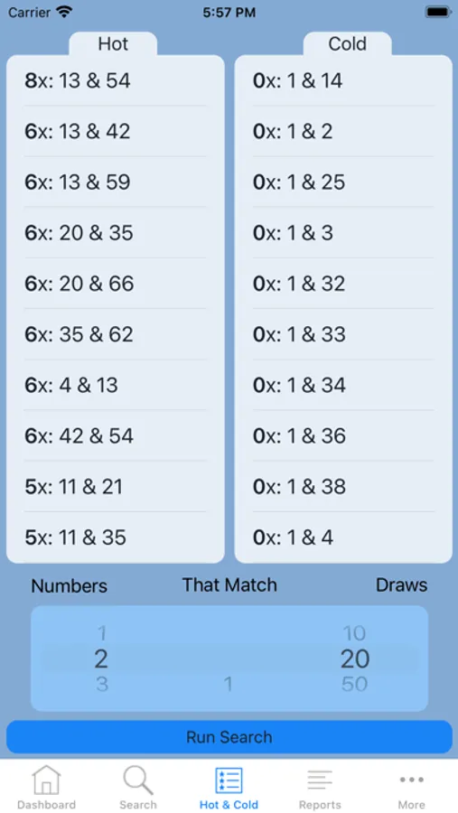 Hot & Cold - This section allows you to see what individual number are hot and cold in the past 10, 20, 50, and 100 draws. In addition, you can see what 2 & 3 numbers together are hot and or cold in the same past number of draws.