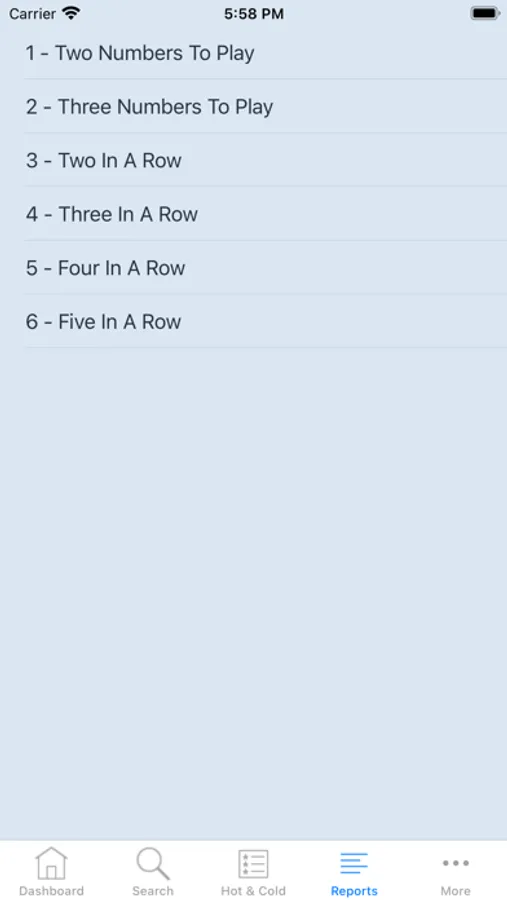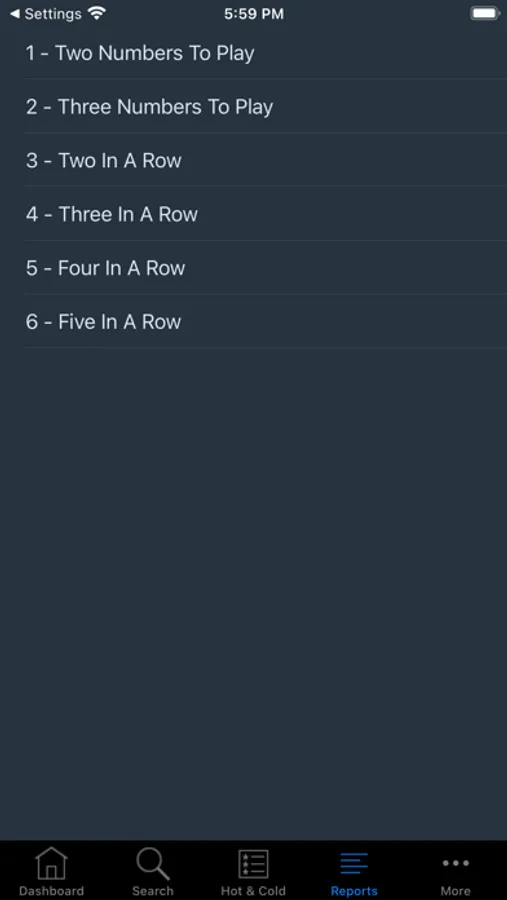 Reports - This section will have a number of different reports that will give information like the history of various combinations of numbers and the frequency of when the are in a keno draw.