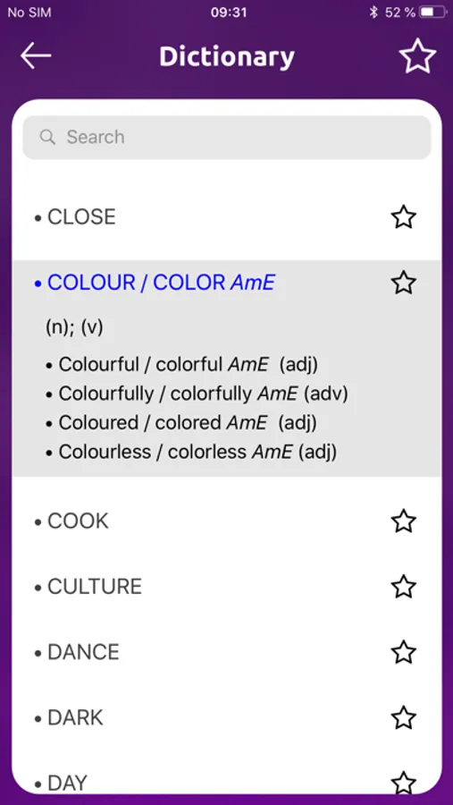 - List of word families in alphabetical order with the possibility to add words to favorites